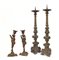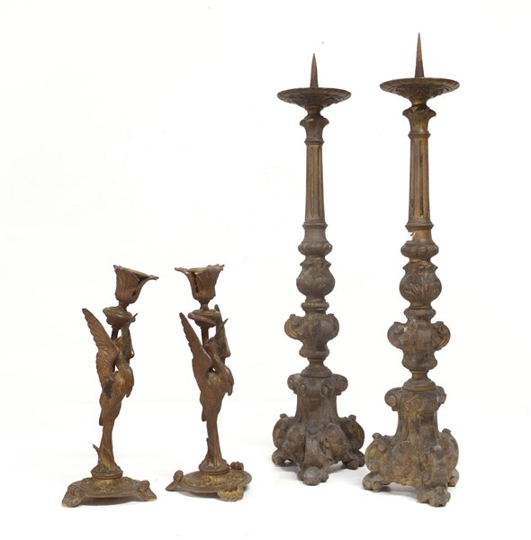 Lotto di due coppie di candelieri; una coppia con base tripode decorata da cherubini e volute (h cm 58), l'altra con fusto decorato da airone tutto tondo (h cm 29) (difetti e mancanze)