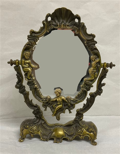 Psiche da tavolo in bronzo decorata con putti in rilievo tra rocaille di foglie (cm 34x21)