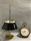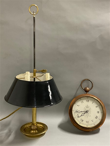 Lampada bouillotte a tre luci in metallo dorato con paralume in lamiera smaltata (h cm 80), unita a un orologio da parete con meccanismo, cassa in legno e quadrante a numeri romani (d cm 24) (difetti)