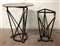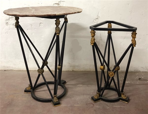 Tavolino con base in in ferro verniciato nero ed elementi decorativi a figure muliebri, fioroni e zampe ferine, piano in marmo (cm 64x77x53), unito a una base identica più piccola (h cm 64) (difetti e mancanze)