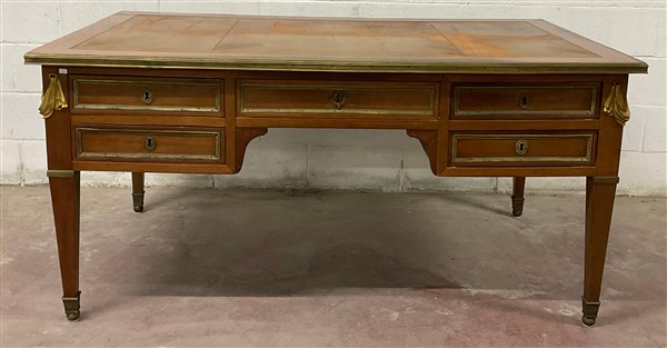 Scrivania da centro a cinque cassetti con filettature, puntali ed elementi decorativi in metallo. Piano con inserto in pelle impressa. Secolo XIX (cm 161x80x99) (difetti)