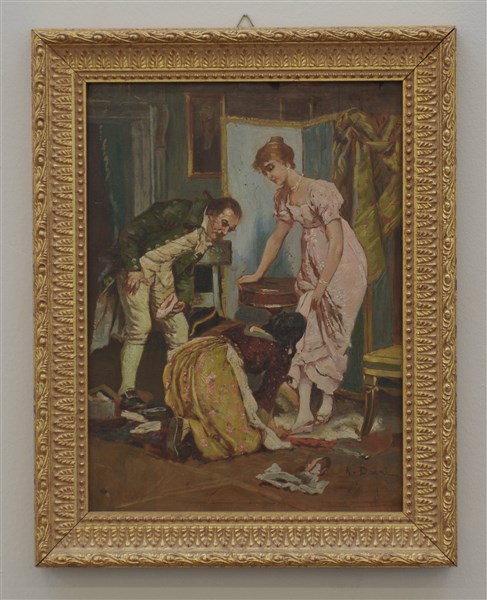"I preparativi" olio su tavola (cm 30x22) Firmato in basso a destra, in cornice