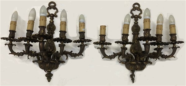 Coppia di appliques a cinque fiamme in bronzo decorato a volute vegetali (h cm 52) (difetti)