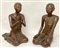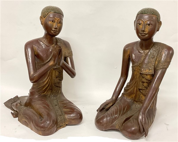 Coppia di figure in legno intagliato e laccato con applicazioni in pasta vitrea