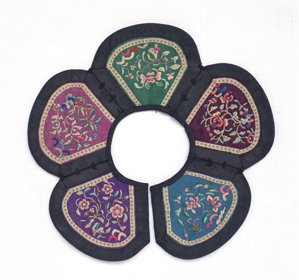 Collare per abito, realizzato con tessuti di seta ricamati in seta di colore differente. Cina, inizio secolo XX (d. cm 27 ca) (lievi difetti)