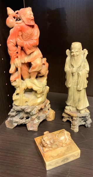 Lotto composto da una scultura in pietra saponaria raffigurante contadino con zucche, una scultura raffigurante saggio ed un sigillo con presa a cane di Pho. Cina, fine dinastia Qing (h. max cm 25,8)