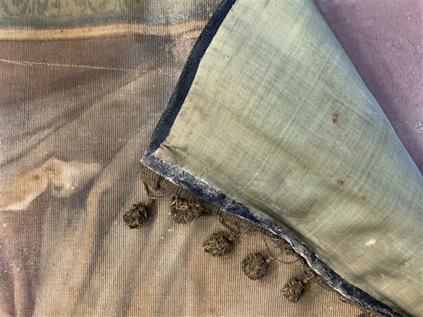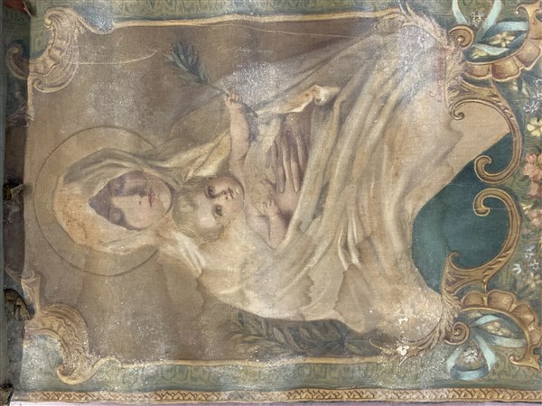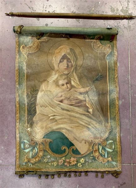 Arazzo dipinto su tessuto cannettillè in cotone raffigurante Madonna con Bambin