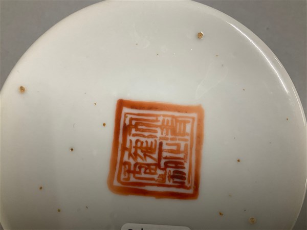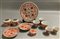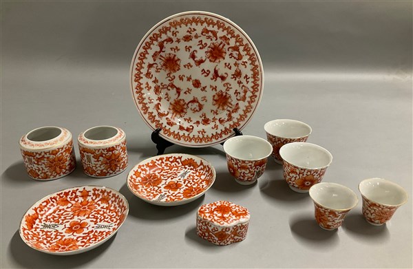 Lotto composto da due sciacqua pennelli, cinque tazzine, una scatolina polilobata, un piatto fondo e due piattini in porcellana bianca con decoro rosso ruggine