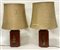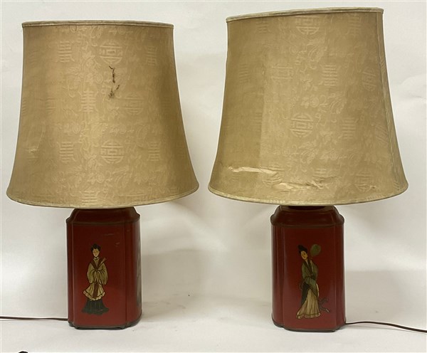 Coppia di lampade con basi in metallo smaltato a fondo rosso e decorato con fig