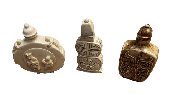 Lot 131 | Lotto di tre snuff bottles in avorio/osso di cui una a forma di doppia zucca Ci