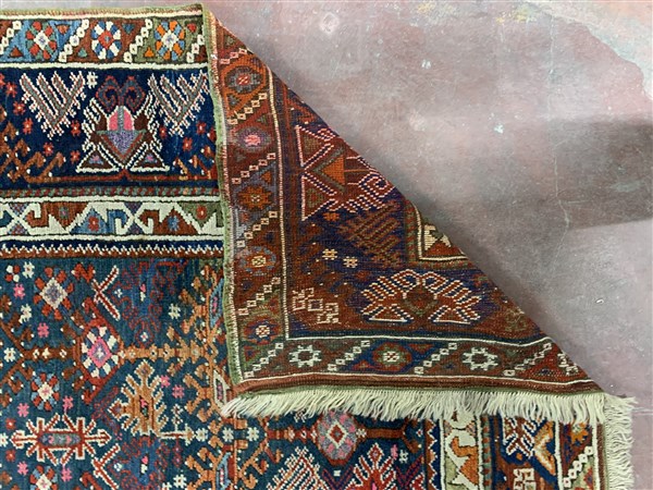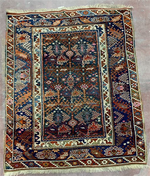 Tappeto Bergama, Anatolia, inizio secolo XX. Decoro all over con rami e fiori stilizzati nei toni del bianco, rosa, arancio, mattone e azzurro su fondo blu carta da zucchero. Bordura principale a meandro con foglie dentate e motivi araldici su fondo blu. Bordura interna di ispirazione caucasica con draghi disposti a teste contrapposte su fondo bianco (cm 166x127) (lievi difetti)