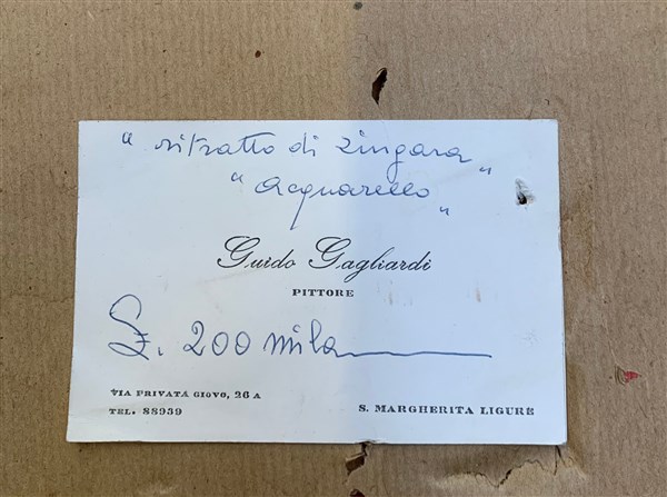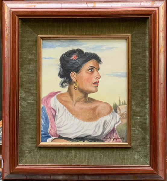 "Ritratto di zingara" acquerello su carta (cm 27x23) Firmato in basso a destra. Al retro: cartiglio del pittore. In cornice