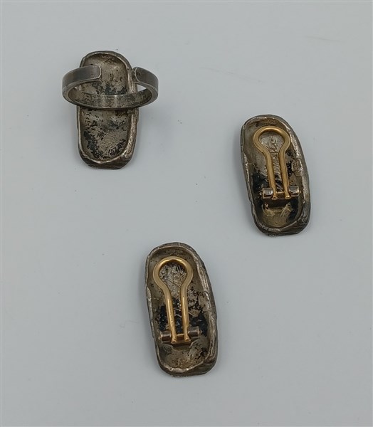 Lotto composto da sei pendenti di copie multiple di Arnaldo Pomodoro in metallo color oro, un pendente con segno zodiacale del cancro in argento 925 uniti ad anello ed orecchini firmati Finotti in metallo, in parte dorati