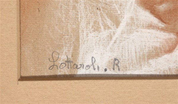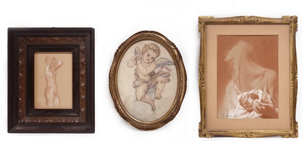 Lotto di tre disegni: due a sanguigna e biacca raffiguranti nudo femminile e deposizione, firmati, uno ad inchiostro e acquarello raffigurante putto alato, autori e misure diverse, in cornici