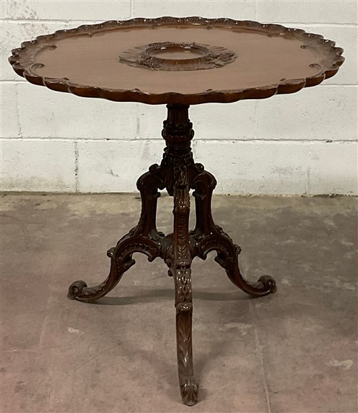 * Tavolino a vela di forma circolare, intagliato a volute, motivi fogliati e grappoli d'uva. Piano e base sagomati. Inghilterra secolo XIX. (d cm 74 h cm 74) (difetti)
