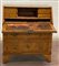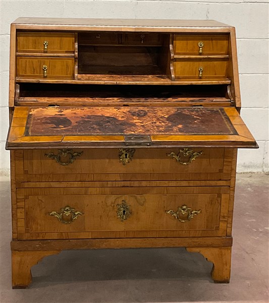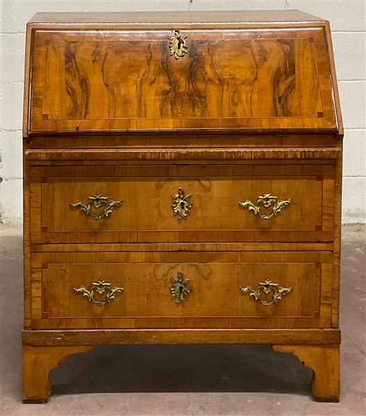 Antica ribalta lastronata in noce e radica di noce. Fronte a due cassetti più reggipiano estraibile. Calatoia celante due piani scrittoio rivestiti in pelle, vani e cassettini. Guarnizioni in metallo dorato e piedi a mensola (cm 86x101x52) (difetti)