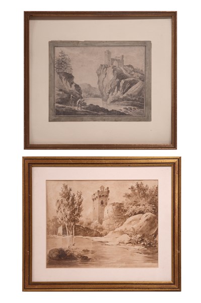Lotto di due disegni ad acquarello e matita, uno del secolo XVIII, raffigurante un paesaggio fluviale con figure, l'altro paesaggi lagunare con torre, del secolo XIX, autori e misure diverse, in cornici