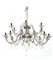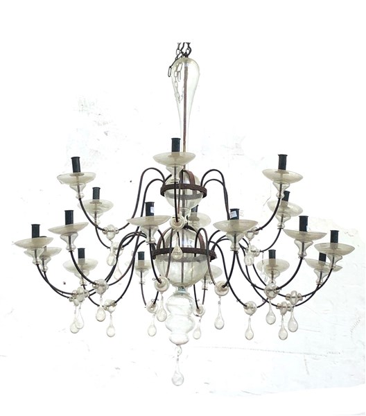 * Lampadario a diciotto luci su due ordini in ferro battuto e vetro soffiato, con bracci ricurvi e pendagli. Murano, secolo XIX (h cm 120) (difetti, rotture e mancanze)