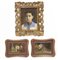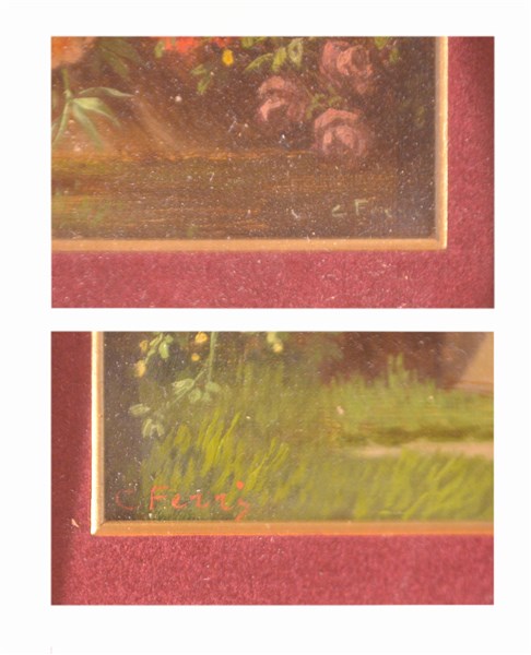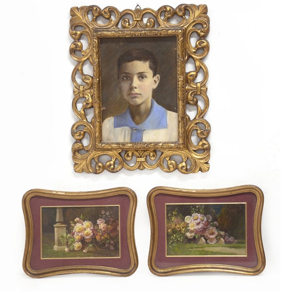 Lotto composto da un dipinto ad olio raffigurante "Volto di giovane" in cornice di legno dorato e traforato e due dipinti ad olio raffiguranti "Composizione con fiori" firmati C. Ferri in basso, in cornici