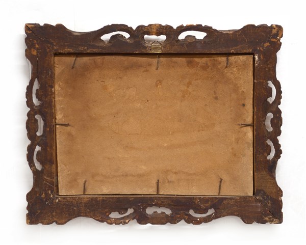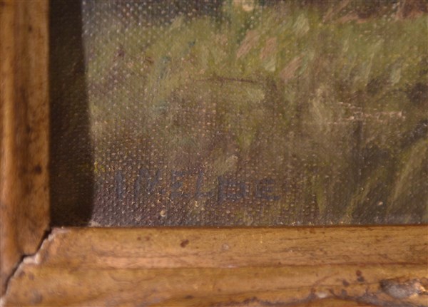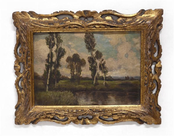 Firma indecifrata "Paesaggio" olio su cartone telato (cm 21x30) firmato in basso a sinistra, in cornice sagomata in legno dorato e traforato