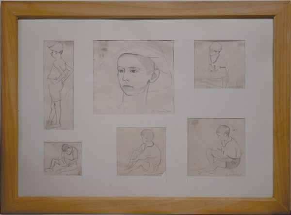 Lotto composto da sei disegni raffiguranti un volto giovanile e cinque figure bambinesche, misure diverse, firmati, contenuti in un unica cornice (difetti)