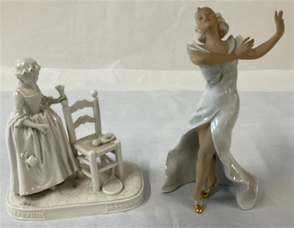 Lotto composto da un gruppo in porcellana bianca raffigurante fanciulla che gioca a volano e una figura raffigurante una ballerina in porcellana di manifattura tedesca (h max cm 25) (difetti e mancanze)
