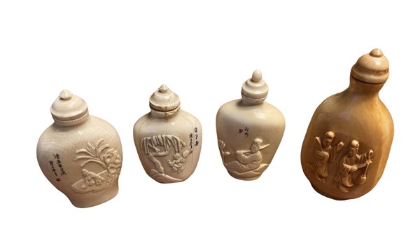 Lotto di quattro snuff bottles in avorio/osso decorate a rilievo con figure Ci