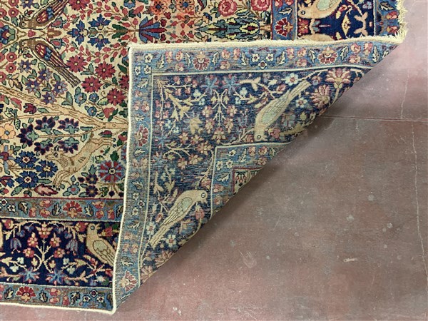 Tappeto preghiera Kirman, Persia, inizio secolo XX. Mirab a fondo bianco decorato con motivo "giardino dell'Eden", con alberi fioriti, mazzi di fiori, animali e volatili. Bordura a fondo blu notte con volatili e rami fioriti disposti a meandro (cm 220x134) (lievi difetti)