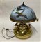 Abat-jour da tavolo biansata con base in ottone e paralume in vetro acidato decorato a paesaggio con volatili. Secolo XX. (h cm 47) (lievi difetti)