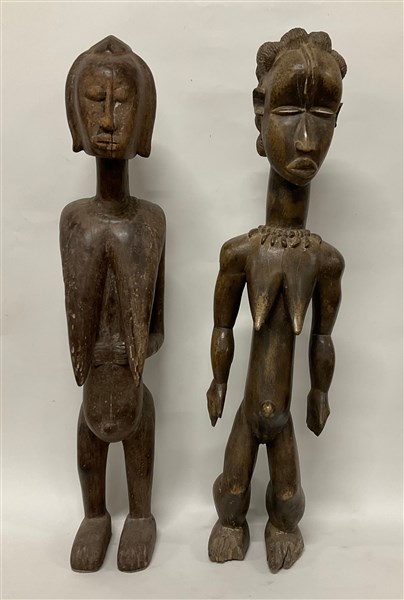 Arte africana, lotto di due figure femminili in legno scolpito, etnie differenti (h cm 99) (difetti e mancanze)