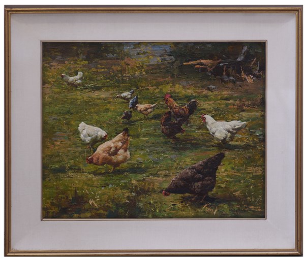 "Galline nel prato" olio su compensato (cm 40x50) Firmato in basso a destra. Al retro: titolato e firmato. In cornice