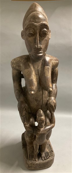 Arte africana, scultura in legno raffigurante una madre seduta con due bambini (h cm 80) (difetti)