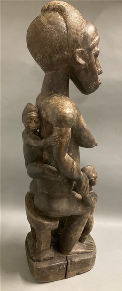Arte africana, scultura in legno raffigurante una madre seduta con due bambini