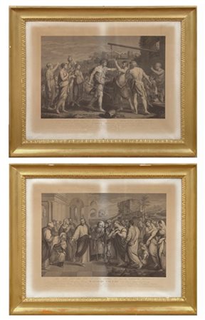 Lotto di due incisioni intelaiate del secolo XIX da opere di Tiziano e Poussin (cm 63x81), in cornici del sec. XIX (difetti)