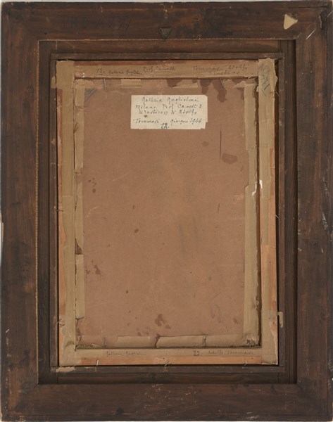 (Attribuito) "Rustico" olio su tavola (cm 45x31) Al retro: cartiglio della Galleria Guglielmi, Milano. In cornice