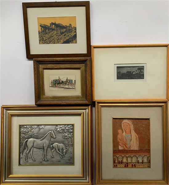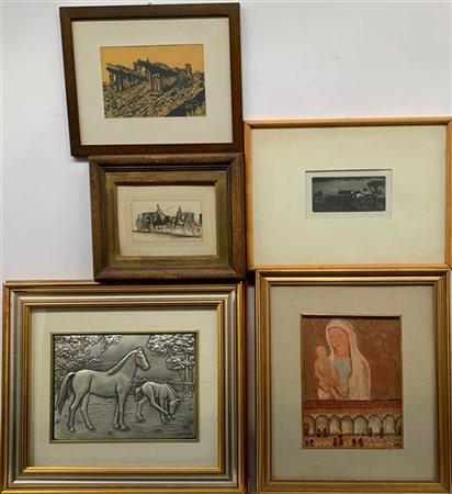 Cartone contenente dieci opere tra riproduzioni, grafiche, multipli su lastra, disegni e piccoli dipinti, di autori, soggetti e misure diverse