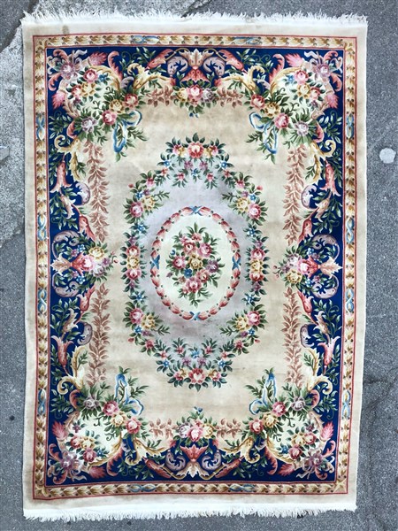 Tappeto Cina, secolo XX. Decoro francese con ovale su campo beige (cm 350x248) (difetti)