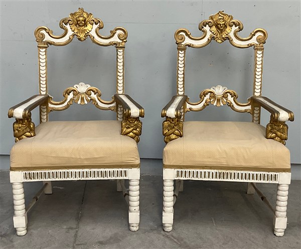 Coppia di antiche poltrone in legno intagliato,laccato e dorato. Schienale a giorno di forma sagomata con al centro della cimasa a testa di cherubino. Braccioli terminanti a ricciolo sostenuti da figure con braccia incrociate. Gambe anteriori tornite. Lacca e doratura di epoca posteriore (difetti)