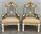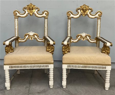 Coppia di antiche poltrone in legno intagliato,laccato e dorato. Schienale a gi