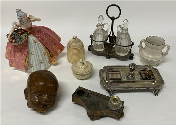 Lotto composto da un servizio da tavola, due calamai, una figura plastica, una scultura raffigurante testa di fanciullo e tre contenitori diversi in metallo e ceramica (gravi difetti e mancanze)