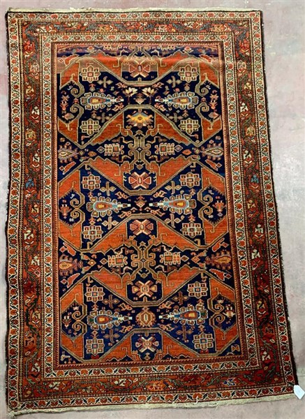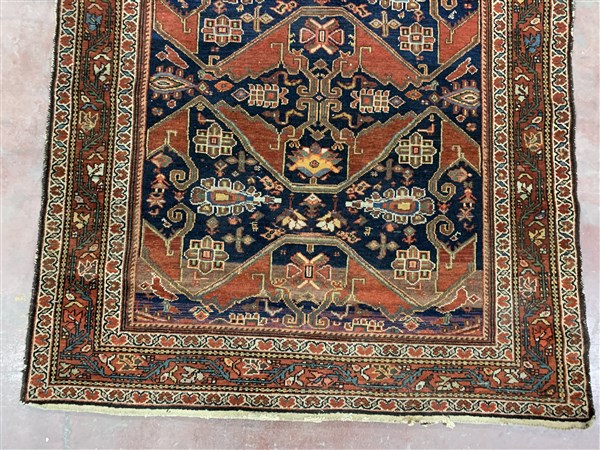 Tappeto Ferahkan, Persia, fine secolo XIX. Decoro geometrico rosso su fondo blu cosparso di disegni Kashmir, fiori e figure antropomorfe stilizzate. Bordura a meandro su fondo rosso (cm 190x124) (difetti)