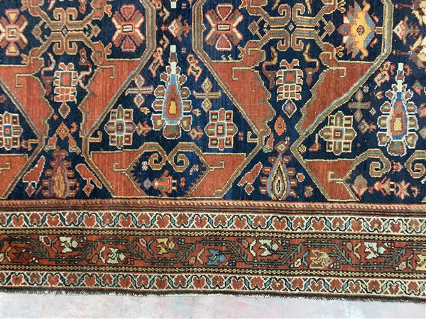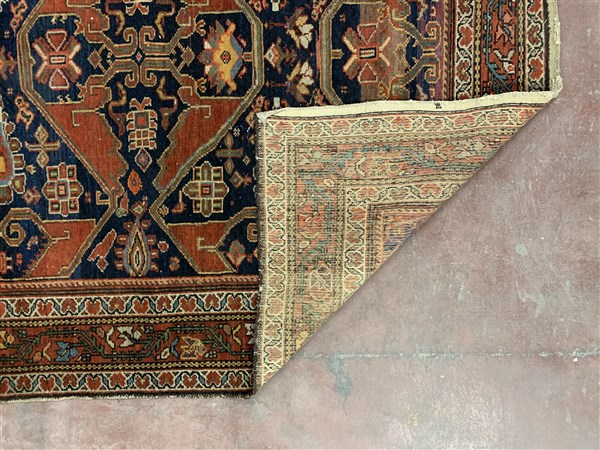 Tappeto Ferahkan, Persia, fine secolo XIX. Decoro geometrico rosso su fondo blu