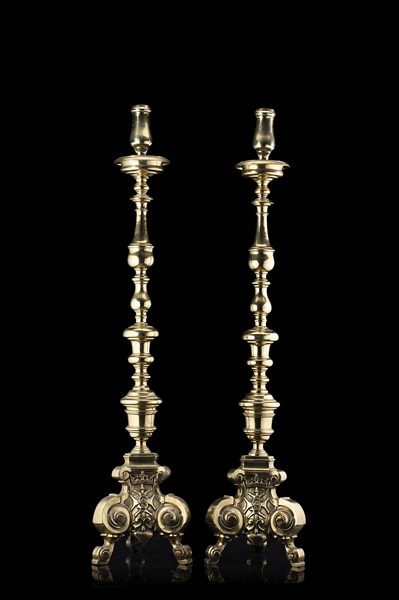 Coppia di candelieri tripodi in bronzo dorato con fusto a balaustro, basi decorate a stemma iscritto e monogramma "S" coronato tra volute (h. cm 96,5x20x20 ca.) (lievi difetti)