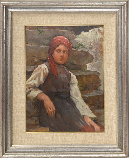 "La pastorella" olio su cartone applicato a tela (cm 51x36) Firmato su un cartiglio in basso a sinistra. In cornice (difetti)