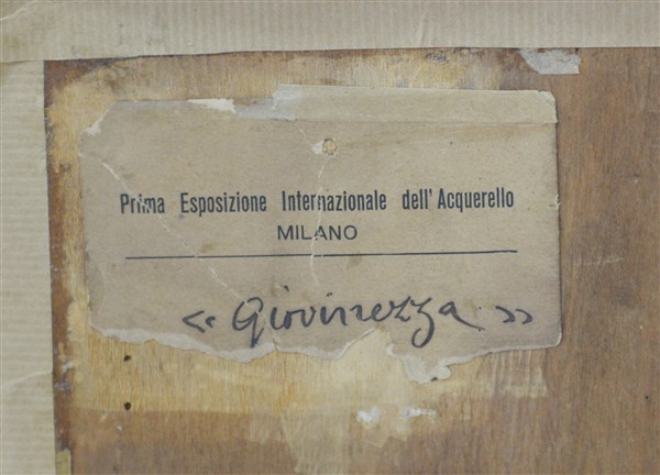 "Giovinezza" acquerello su carta (cm 85x65) Firmato in basso a sinistra. Al retro: cartiglio I Esposizione Internazionale dell'acquerello, Milano. Bibliografia: "Ottocento" Edizioni d'Arte Silbernagl 2008. In cornice (difetti)