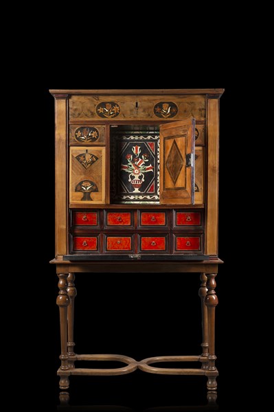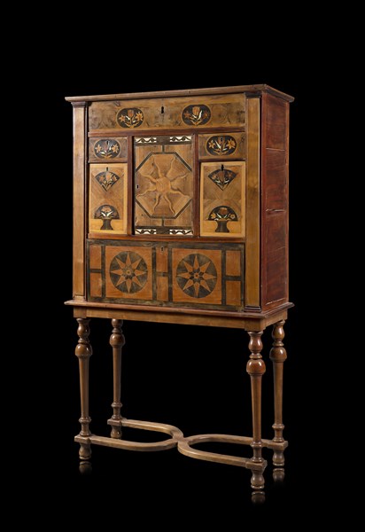 Monetiere lastronato a cinque cassetti di diversa misura intarsiati a motivi floreali, sportello centrale celante pannello in legno ebanizzato intarsiato in osso e finta tartaruga a vaso fiorito e volute, anta inferiore celante cinque cassetti di diversa misura. Base a quattro gambe tornite riunite da traverse sagomate. Nord Europa, secolo XIX. Base di epoca posteriore (cm 96x168x41) (difetti)