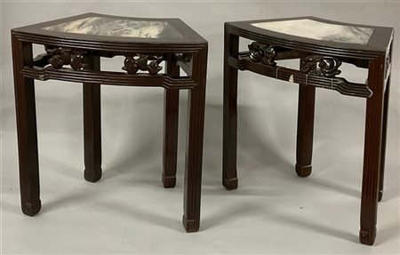Coppia di tavolini sagomati in legno intagliato e con pianettto in marmo incass