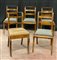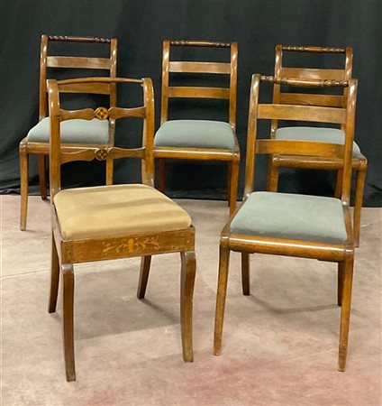 Lotto composto da quattro sedie in legno intagliato, schienale a giorno, gambe a sciabola; unite ad una sedia simile (lievi difetti)