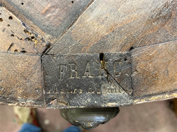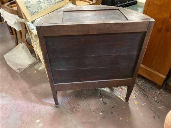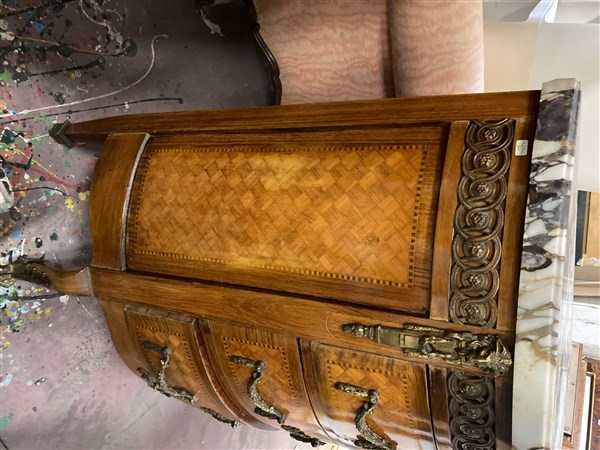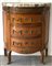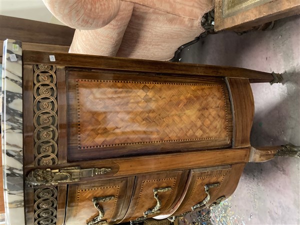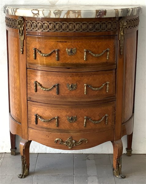 Comoncino bombato a tre cassetti, lastronato e intarsiato a marqueterie, fregi, profili e scarpette in bronzo dorato e cesellato, piano in marmo fior di pesco. Stampigliato sotto il piano "Franc Maitre Ebaniste" (cm 70x83x35) (difetti)