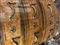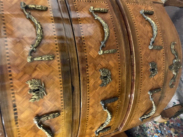 Comoncino bombato a tre cassetti, lastronato e intarsiato a marqueterie, fregi,
